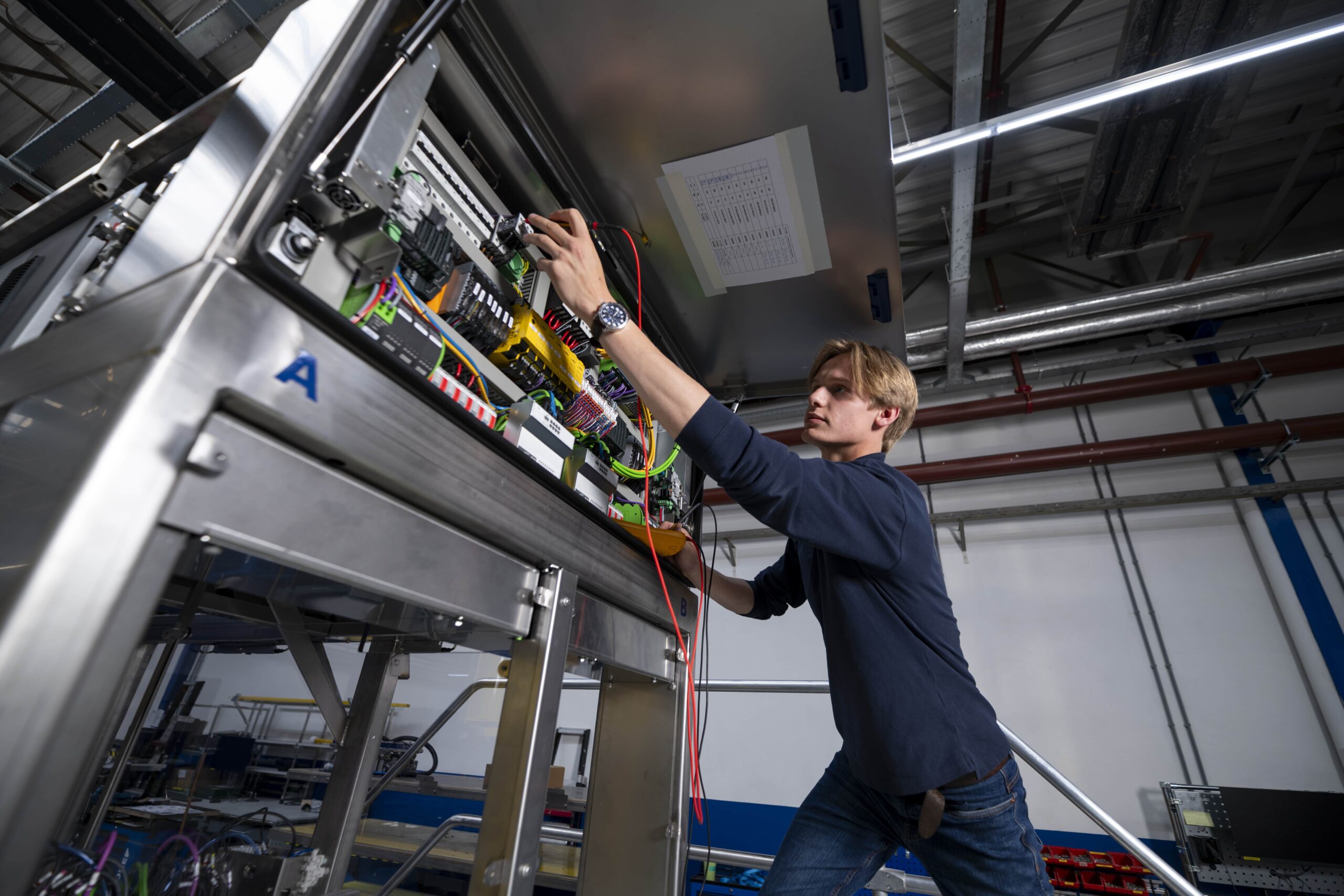 Naast monteur is Joris ook junior teamleider. “Overdag ben ik daarom vooral de regelneef. Dan zorg ik ervoor dat de juiste spullen op voorraad zijn en houd ik contact met verschillende afdelingen in het bedrijf. Aan het eind van de dag ben ik vaak zelf aan de machines aan het sleutelen.”